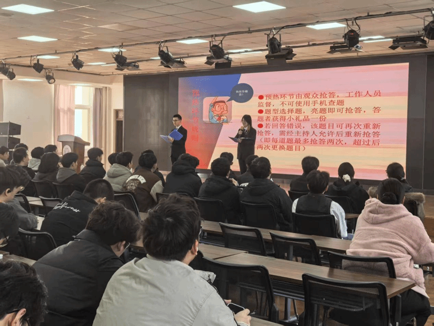 活动伊始,主持人清晰宣读完比赛规则,决赛正式拉开帷幕。开场首先进行5道观众抢答题,题型轻松有趣,迅速点燃了现场气氛,答对的观众获得了精美小礼品。随后进入班级代表队比拼环节:10支队伍首先通过必答题紧张对决,产生8强;再经一轮必答题筛选,决出6支晋级队伍。紧接着的“6进3”风险题环节,选手依据当前成绩选择题目,并可向亲友团求助,答对加分、答错扣分的赛制使得竞争悬念迭起。此后还设置了观众互助答题环节,由观众抢答并为指定队伍加分,进一步拉近了赛场与观众的距离。