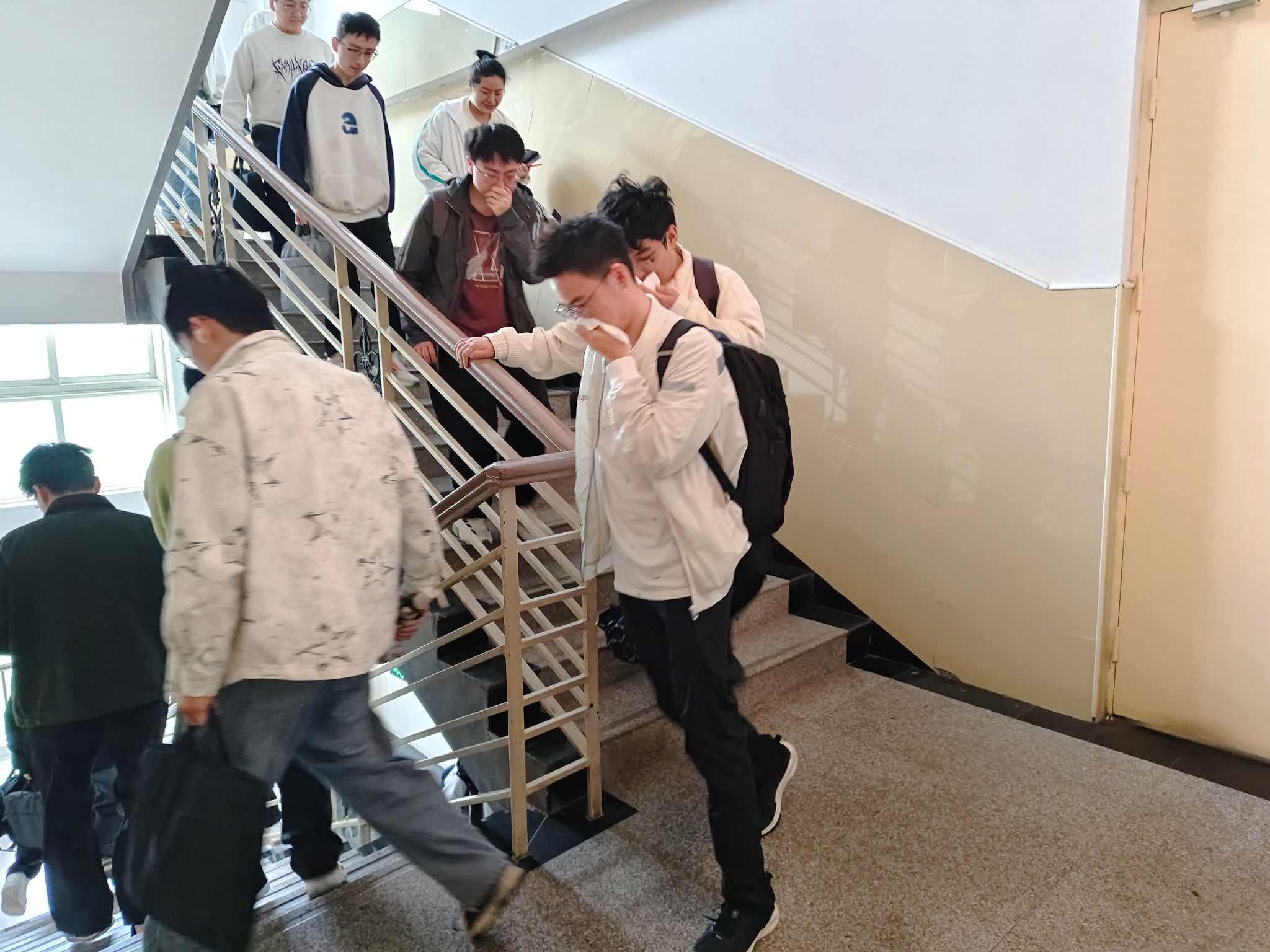 本次演练以基础实验楼610教室模拟突发火情为场景,严格依照“火情确认、警报发布、初期处置、有序疏散、医疗救护、现场讲评”的全流程推进。演练过程中,全体参演师生严格遵循疏散规范,用湿毛巾捂住口鼻,弯腰低姿前行,沿着指定路线有序且快速地撤离。全程未出现拥挤、慌乱的情况,仅用5分钟便完成了全楼栋人员安全疏散,充分展现出良好的安全素养与应急配合能力。